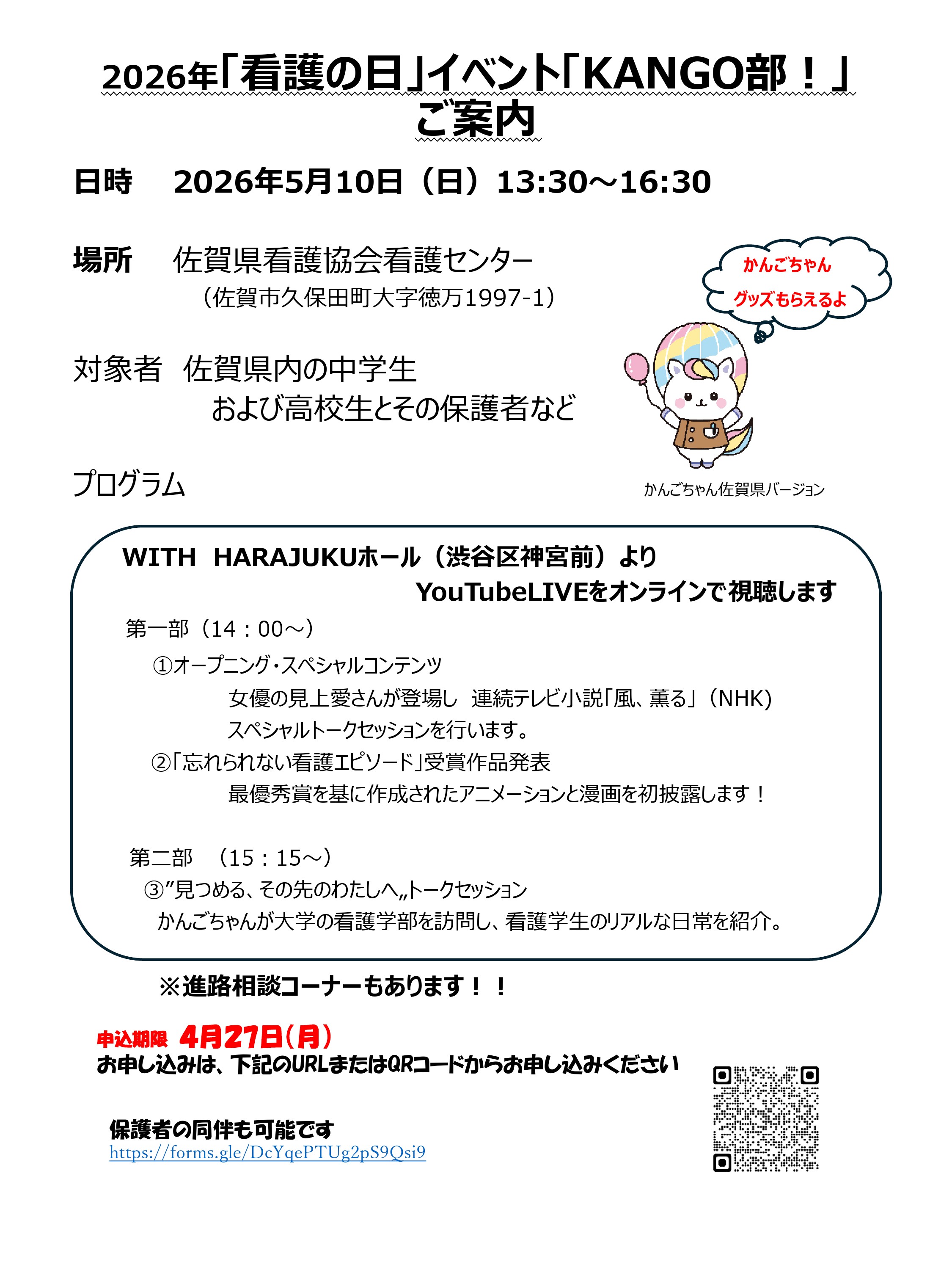 2026年5月10日(日)に開催される「看護の日」イベントパブリックビューイングを佐賀県看護協会看護センターで行います。来場いただいた方には、看護の日グッズをご準備しておりますので、お時間のある方はぜひ会場へお越しいただき、イベントにご参加ください。なお、保護者の同伴も可能です。